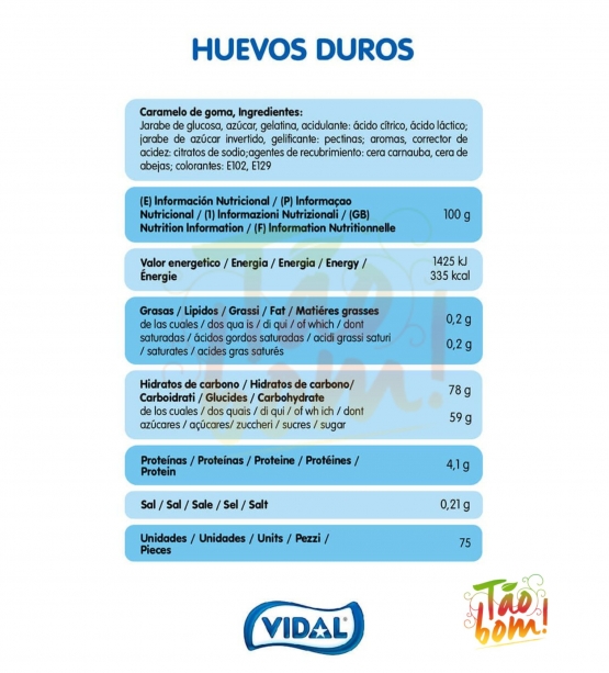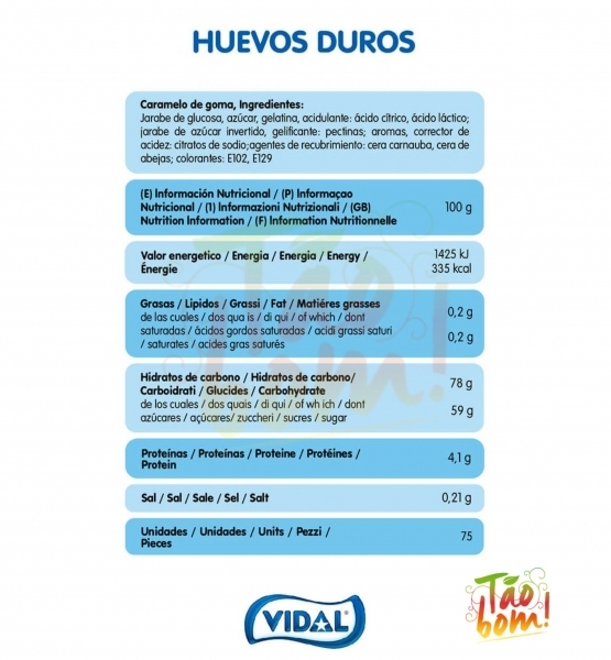 Ingredientes: xarope de glicose, açúcar, gelatina, acidulante:
